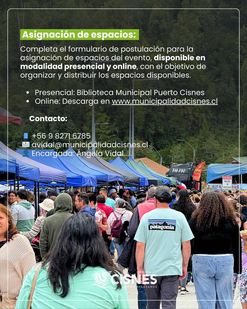 El proceso contempla una etapa inicial de postulación y asignación preliminar de espacios, la cual se efectúa mediante la presentación de un formulario de solicitud, disponible de manera presencial en la Biblioteca Municipal y en formato digital a través del sitio web www.municipalidadcisnes.cl. Dicha etapa tiene por finalidad ordenar y distribuir los espacios disponibles para el adecuado desarrollo de la actividad.