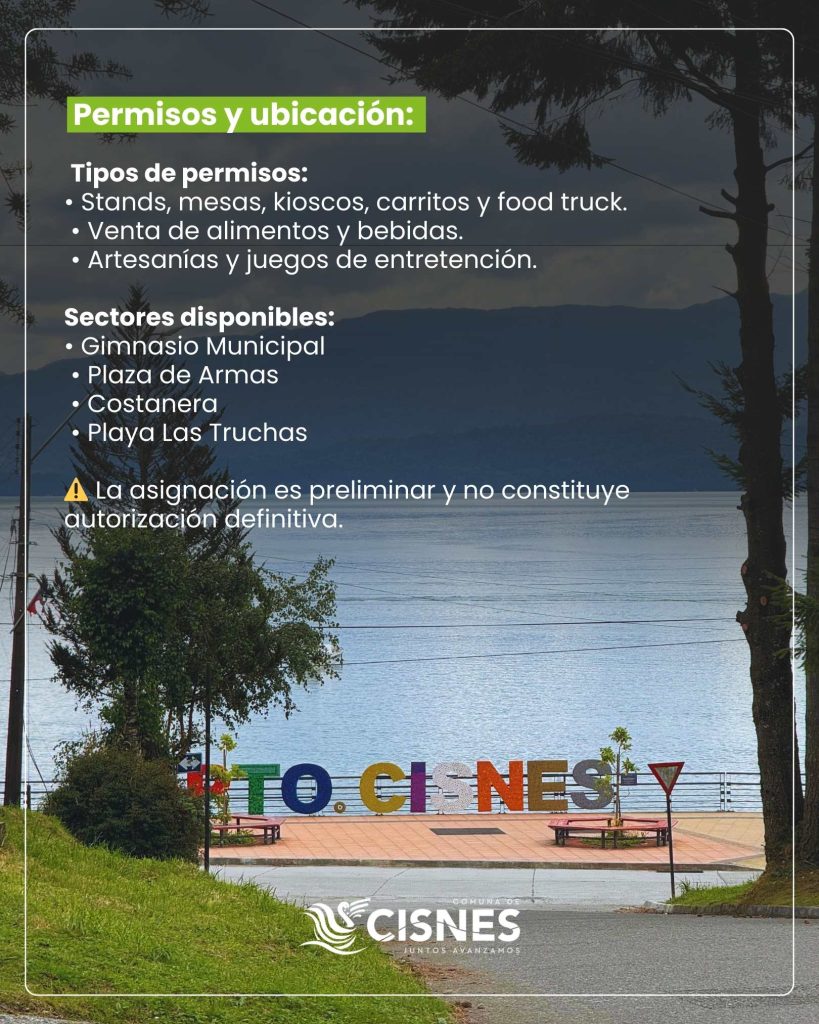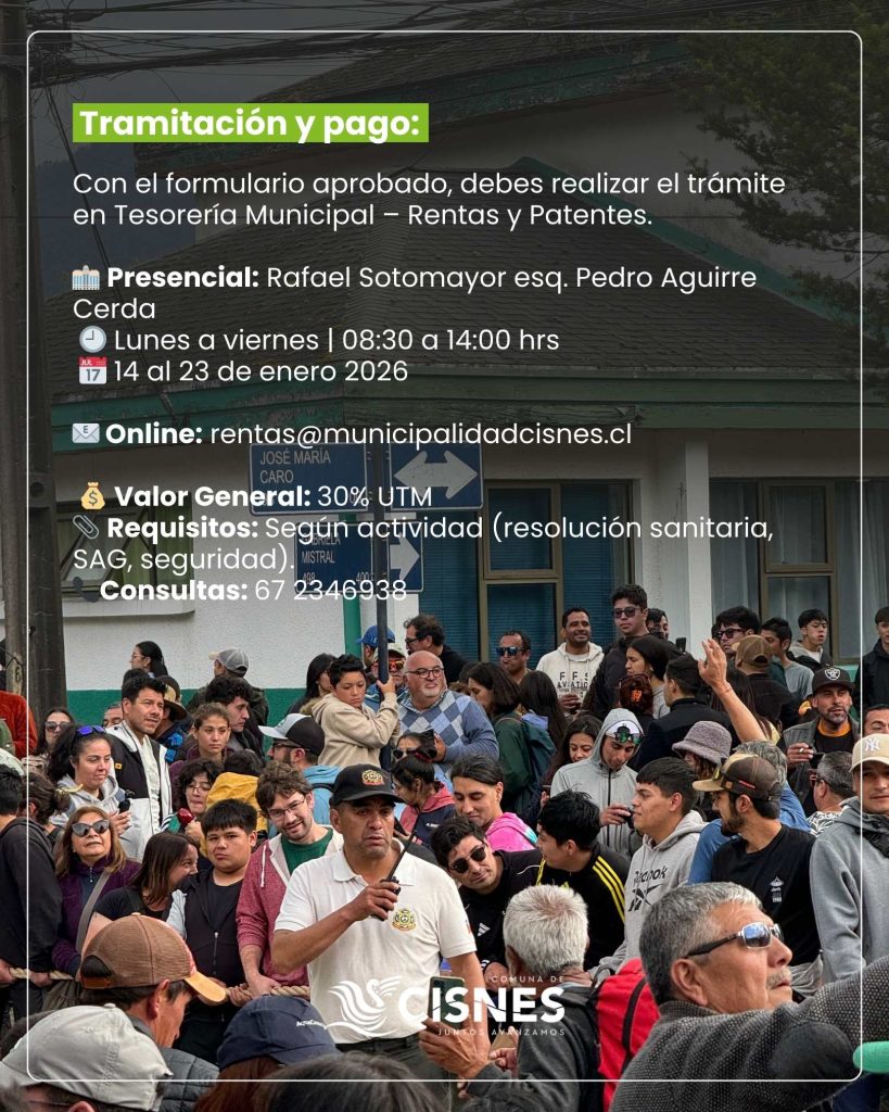 Dicho trámite podrá efectuarse de manera presencial entre hasta el 23 de enero de 2026, en horario de lunes a viernes, de 08:30 a 14:00 horas, o bien mediante el envío de los antecedentes requeridos al correo electrónico rentas@municipalidadcisnes.cl. El valor del permiso corresponde al 30% del valor de la UTM, conforme a lo establecido en la Ordenanza Comunal de Derechos Varios.